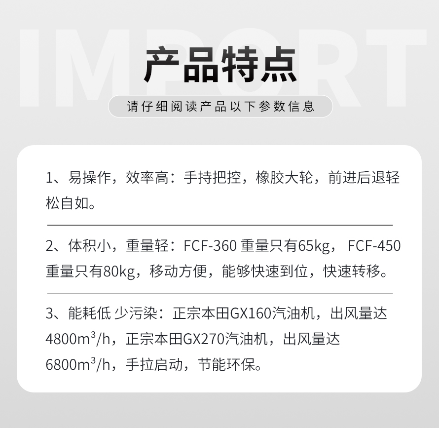 FCF-450路面吹風(fēng)機采用本田汽油動力,性能穩(wěn)定。風(fēng)葉動力平衡性強,保證整體的穩(wěn)定性。大風(fēng)量,性能優(yōu)越。